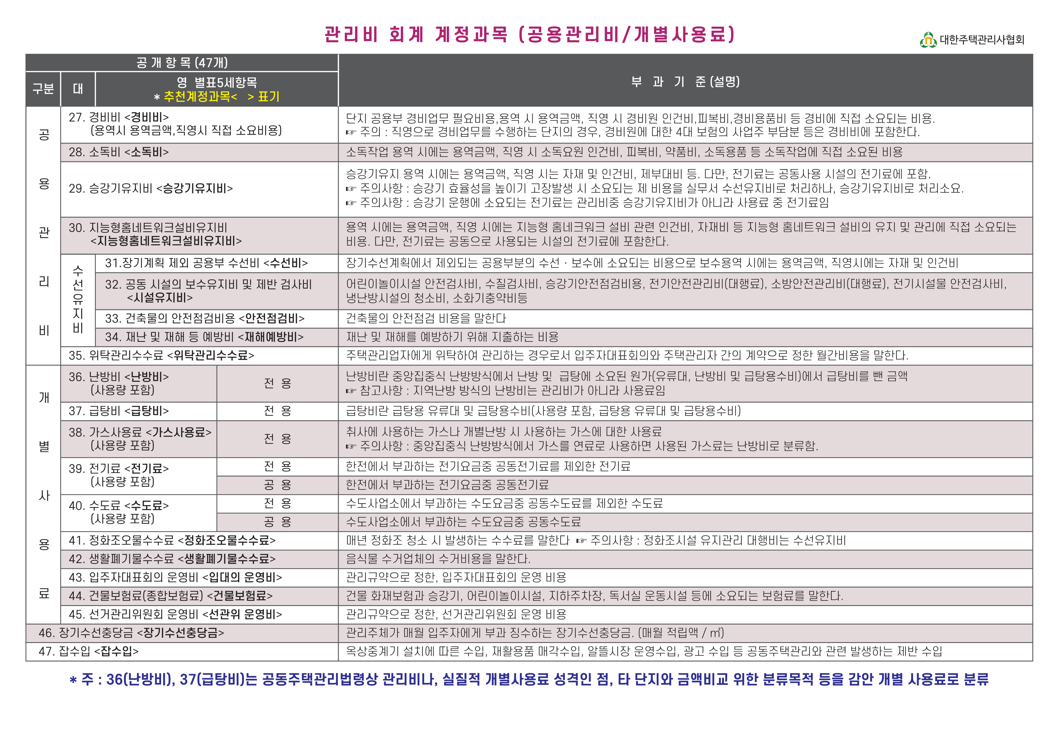 관리비 회계 계정과목(공용관리비/개별사용료)