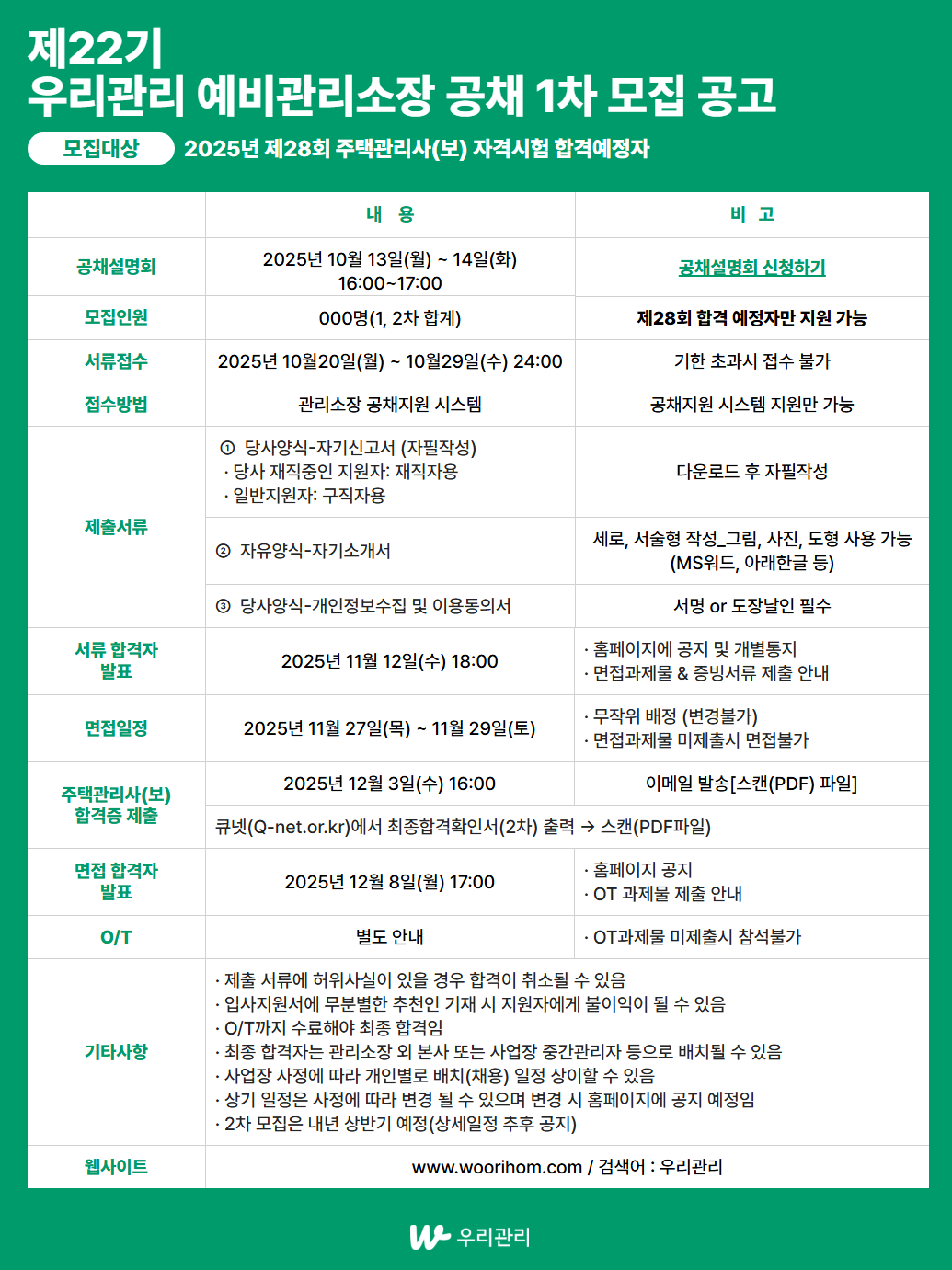 제22기 우리관리 예비관리소장 공채1기 모집공고
